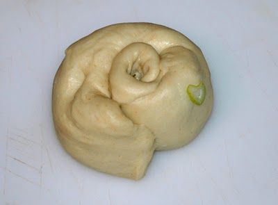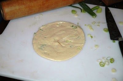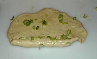 Возьмите охлажденное тесто и разделите его на четыре части. Возьмите одну часть, и раскатайте его в круг около 25 см в диаметре. Намажьте слегка с кунжутным маслом, и посыпьте нарезанным зеленым луком и скрутите его в форму сигары.