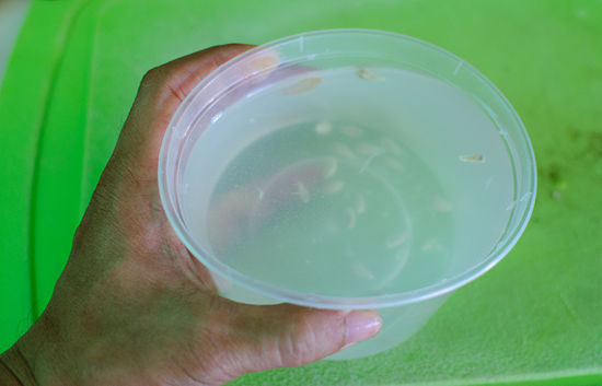 Смешайте лимонный сок с водой. Разрежьте лимон пополам. Выжмите сок в микроволновый контейнер и смешайте примерно с 300 мл воды.